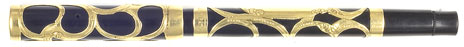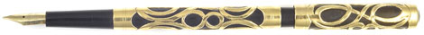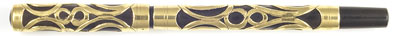 15143: unmarked eyedropper-filler: black hard rubber slip-cap, 13.6 cm long, gold filled Art Nouveau filigree overlay has not a trace of brassing (was sold to us as tested as 14K, but more likely top quality very thick gold laminate). Closely resembles a Waterman, similar quality but parts do not interchange. #2 warranted nib is a notable writer, only slightest fading to hard rubber.
