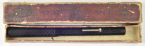 17135: De La Rue (?) Boots "Chatsworth" in box: black chased hard rubber clipless lever-filler, 13.6 cm long, nickel plated trim, small 14K nib retains only scant tipping but is nonetheless a notable writer; imprints and chasing good, noting two patches on the cap of heat exposure erasing the chasing.