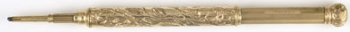 17091: Fairchild magic pencil: gold filled with unusual foliate hand engraving with considerable fine detail; longer model, 7.1 cm long closed, 12.4 cm extended, uses 1.5 mm lead.