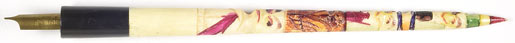 17094: unmarked dip pen: souvenir of the Pacific Northwest in the form of a totem pole, 15.2 cm long excluding bronze nib, hand carved and painted bone, hard rubber grip section.