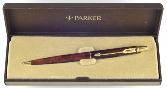17107: Parker Classic Laque ballpoint in box: early production French lacquer, "Tortoiseshell" with Chinese two-character signature on barrel, narrow gold plated bands at joint, and band at top marked "PARKER" and "MADE IN FRANCE".