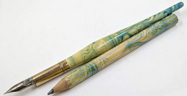 17146: American Pencil Co. "The Twins" dip pen and pencil set in box: giant novelty set, wood with swirl-pattern lacquer finish, pen is 25.5 cm long excluding steel "Midget" falcon nib, octagonal "Whoopee" pencil is a real pencil, with thick lead all the way through. Usual age cracquelure to finish, bumps to box, as new with just age and storage wear.