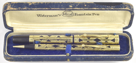 16521: Waterman 0552 Filigree set in box: black hard rubber lever-filler with green gold filled overlay, 13.9 cm long, matching pencil uses 1.1 mm lead, later mechanism both propels and retracts; clean set, only slight fading, no dings, pen cap has a partly visible seam section (see detail -- a manufacturing flaw which does not affect function, condition otherwise excellent). Nib is smooth and lively, a writer's writer.