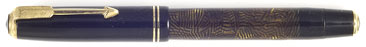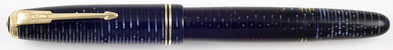 16556: Parker Vacumatic Junior: blue pearl laminate, 12.7 cm long, gold filled trim, Canadian manufacture, imprint worn but mostly legible; notable nib writes an elegantly shaded line.