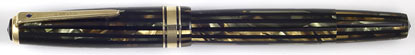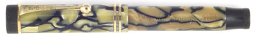 16754: Parker Duofold Senior: green and brown pearl Vac-filler with black stripes, 13.4 cm long, gold filled trim, Blue Diamond clip, triple cap band, aluminum Speedline filler; largest size, much scarcer than contemporary Vacumatics; strong imprint with 4th quarter date code, matching 3rd quarter date code on nib, good barrel transparency, excellent condition but for missing blind cap trim ring; a notably smooth and pleasant writer.