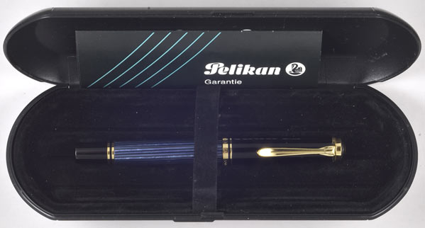 17064: Pelikan R400 Souverän rollerball in box: black with blue pearl striped barrel, gold plated trim; cap is cracked (see detail) but pen fully functional, selling as is (replacement caps are available, same as for M400). Box is for an R200.