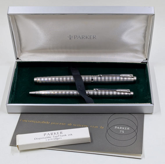 17120: Parker 75 Ecossais set in box: scarce pattern, silver plate, made in France, early production with 30 microns mark, solid flat ends, section with angle indicator, French-made 14K nib, old style thick metal squeeze converter. Doubly scarce in Italian-market packaging with characteristically Italian serial number on section; angle indicator lines are also of atypical form (see details). Cap-actuated ballpoint uses standard refills.