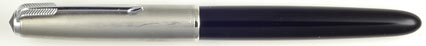 17212: Parker 51: early production black Aerometric filler, frosty Lustraloy cap, chrome plated trim, bold barrel imprint with 3rd quarter date code, early construction with transparent Lucite connector, chrome filler housing with "PRESS . . . 6 TIMES" imprint, new sac with perfect transparency.