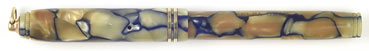 17218: Gold Bond lever-filler: blue-veined pearl ringtop, 11.7 cm long, gold filled trim, knurled ends, unusual and striking celluloid; name on barrel, moderate ambering, #2 warranted nib is extraordinarily flexible, opening easily with the slightest touch.