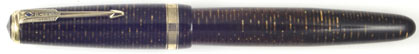 17220: Parker Vacumatic Maxima: golden pearl laminate oversize single-jewel, 13.6 cm long, gold filled trim, Blue Diamond clip; single-jewel Maximas are uncommon, and this example displays a number of unusual features characteristic of early wartime production, including a striped cap jewel and a plastic-bodied filler unit with diamond imprint on the plunger; barrel transparency is excellent, strong barrel imprint with what appears to be a 4th quarter date code. Nib has 1942 date code along with star imprint on heel, so may be a contemporary swap.