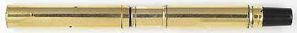 15096: Aikin Lambert sleeve-filler: black hard rubber self-filler, gold filled overlay, 13.6 cm long, barrel sleeve rotates to provide access to pressure bar (Waterman's first sleeve-filler patent of 1905, but used only on subbrand pens and Aikin Lamberts, after Waterman's takeover of Aikin Lambert c. 1907); #3 nib is very flexible, noting the beginnings of a stress crack from the vent hole (see detail). Elegantly engraved monogram on sleeve, very clean with only trace brassing at the edge of the cap top, a high quality pen with an unusual filling mechanism and excellent overall appearance, especially uncommon with a plain smooth overlay.