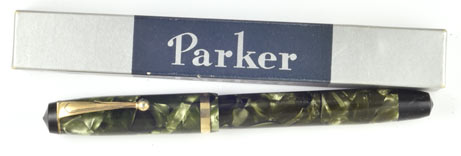 17158: Parker Challenger in box: black-veined green pearl button-filler, 13.1 cm long, gold plated trim, strong imprint with 3rd quarter date code, clean condition noting a few plating losses to the clip (see details).