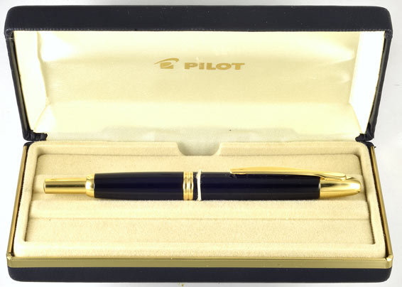 14757: Pilot Super 150L: black tab-filler, 13.6 cm long, gold plated trim, wide rolled gold cap band, inlaid 14K gold nib is a precise writer, barrel opens with a bayonet-style twist-lock action rather than unscrewing. Interesting Bulgarian imprint, clean condition noting shallow marring to side of spring-loaded rocker clip (see detail). Full date code DO 09, for 9 March 1963.
