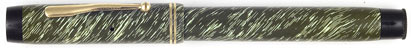 17031: Seth Crocker pneumatic-filler: olive green with white helical streaks, 13.25 cm long, gold filled trim, hole-less end knob with inner valve, warranted nib; scarce and desirable Chilton family offshoot, most of these were made for sale at various large department stores and are so marked, in this case for W. C. Stripling & Co. of Fort Worth, Texas. Patent imprint on barrel, correct warranted 14K nib is an excellent writer. This pen larger than most of its type, condition also noteworthy.