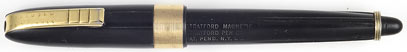 17032: Stratford Magnetic: unique and futuristic design, with the cap held in place at either end of the barrel by magnetic action; black button-filler, 13.2 cm long, gold plated trim, 14K gold Stratford nib, barrel imprint includes "PAT. PEND." indicating manufacture prior to Feb. 15, 1949 issuance of patent D152717.