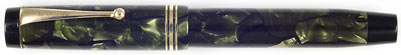 17028: Parker Duofold Senior Deluxe: streamline black-veined green pearl button-filler, 12.9 cm long, gold filled trim, triple cap bands with wider central band; excellent color, hard to find as introduced towards the end of Duofold production, USA barrel imprint but Canadian Duofold nib and late comb feed. Burn pit on end of blind cap (see detail).