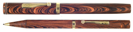 17025: Waterman 7 Ripple set: large red and black hard rubber lever-filler, 14.3 cm long, gold filled trim, "Purple" nib, casein cap band looks more dark red, Canadian production; pencil uses 1.1 mm lead. Minor plating wear to cap band and pencil barrel band, nib is firm but not rigid, a responsive writer.