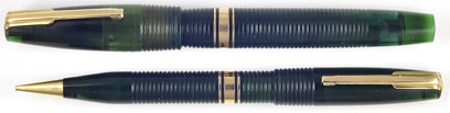 17026: Waterman Hundred Year set: green transparent acrylic lever-filler, 13 cm long, gold filled trim, Canadian production; matching pencil does not work, has globe logo on clip rivet whereas pen rivet is plain.