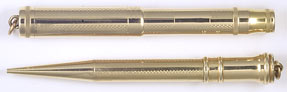 16810: Waterman Gentleman: brushed gold plate cartridge-filler, two-tone 18K gold Super 6 nib, converter included; an Alain Carré design, the first model to bear this name, entirely different from the version introduced in the 1980s. Clip will not hold, internal spring is broken, a few feed fins are chipped (see detail; does not affect function), overall appearance excellent.