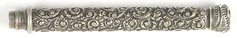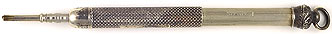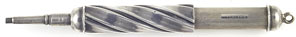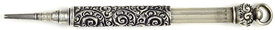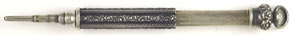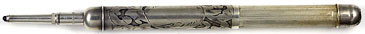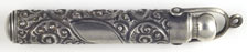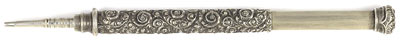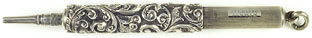 16971: Hicks (?) magic pencil: sterling silver, 7.45 cm long closed, 13.2 cm extended, hand-chased scrollwork, uses 1.4 mm lead.