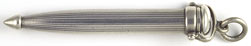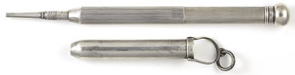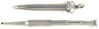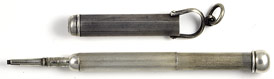 16989: Mordan (?) sheath pencil: sterling silver, three-draw extension tail, 10.8 cm long extended, 6.9 cm closed in suspension holder; marked only with British design registration number, excellent quality, uses thick "W" lead (2 mm). Scattered shallow marks to the holder, otherwise excellent.