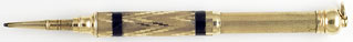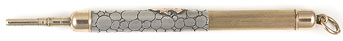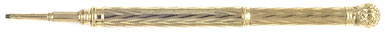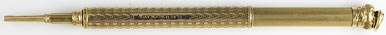 16205: Mordan magic pencil: solid gold but not hallmarked, coarse barley pattern ringtop, 5.35 cm long closed, 9.5 cm extended, uses "VS" 1.5 mm lead; weighs 15.12 grams.