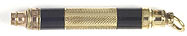16721: unmarked magic pencil: gold filled ringtop, black celluloid barrel sleeve with inlaid piquet work; 4.8 cm long closed, 8.9 cm extended, uses 1.0 mm lead; dents to tip of nozzle, otherwise clean.