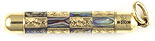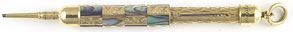 16984: E. S. Johnson magic pencil: beautiful gold filled ringtop with checkerboard abalone inlays, hand-engraved diamond starbursts, engine turned shaft; 8.9 cm extended, Oct. 29, 1872 patent imprint, name and monogram neatly engraved on end piece; uses standard 1.1 mm lead.