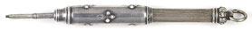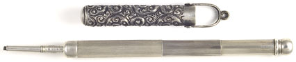 16991: Aikin Lambert magic pencil: sterling silver, suspension sheath holder, double-extension pencil, 6.3 cm long closed, 13.7 cm extended, hand-chased scrollwork, uses 2 mm lead; large and fully marked.
