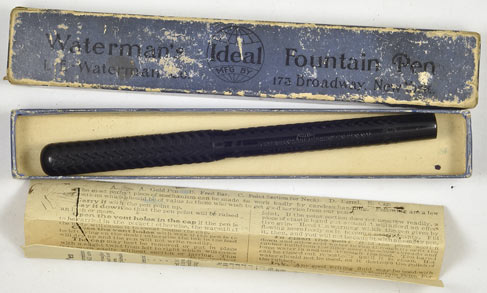 17051: Waterman 12 in box: black chased hard rubber eyedropper-filler, 13.4 cm long, crisp and glossy, long-tined star imprint nib, pre-1903 Spoon Feed with 1899 patent imprint; rounded ends, cap with bold 1898 patent imprint, box and instructions intact with wear and ink stains.