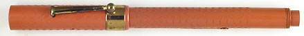 17071: unmarked The Royal Prince: red chased hard rubber lever-filler, 14 cm long, made in England, an economy pen with gold-plated nib and trim, but interesting and unusual; cracks from lever slot (see detail), clip moves from side to side, otherwise showing little sign of actual usage.
