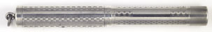 17008: Waterman 52 display pen: black chased hard rubber lever-filler, 13.6 cm long, nickel plated trim; not a functioning pen but rather a dummy made to be attached to a display board; cap and barrel drilled in back, glued together and lacquered black so as to avoid sun fading in a shop window. Barrel has an Aikin Lambert imprint and was drilled for an Aikin-style lever.