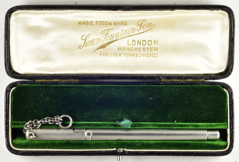 17122: Mabie Todd Swan: black hard rubber eyedropper-filler with barleycorn pattern sterling silver overlay, bayonet-style cap attachment with chatelaine suspension ring and chains; 13.25 cm long, New York manufacture for the British market, pen and box marked for Mabie, Todd & Bard, patent dates up to 1888 but not 1895. Over under feed with twisted silver wire tail, nib is notably broad and juicy. Overall appearance is excellent, but a personalized engraving has been polished off the barrel, there are small shallow dings on the section and barrel, and there is some delamination of the gold visible on the underside of the nib (see details)..