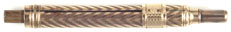 16244: Mordan magic pencil: oversize twist pattern ringtop, sheath suspension style, 7.5 cm long closed, pencil extended 11.9 cm long, uses "VS" 1.5 mm lead. Massive construction, pencil shaft end has been repaired, mostly obliterating the maker's mark and leaving the end knob off center (see details).