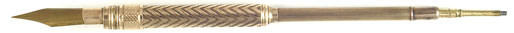 16641: Ripley & Gowan pencil and pocket knife compendium: gold filled, 6.6 cm long, with two knife blades, pencil nozzle extends when end knob is turned, uses 1.4 mm lead; excellent quality, similar to items retailed by Tiffany, Edward Todd, and others.