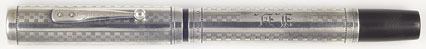 17167: Waterman 452 Gothic: black hard rubber lever-filler, sterling silver overlay, checkerboard pattern, 13.7 cm long, #2 nib is flexible and responsive. Initials engraved in barrel cartouche, light bumps to cap crown, number imprints at exposed hard rubber barrel end polished away, fine overall appearance.