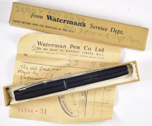 17168: Waterman lever-filler in service box: black lever-filler, 12.6 cm long, chrome plated trim, English manufacture; box annotated in pencil, ex-Captain Hopkins collection. War-era pen, silver cap band, low quality hard rubber used for section.