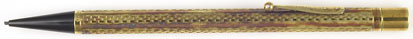 17200: Waterman pencil: black hard rubber with gold filled "Gothic" pattern overlay, 13.3 cm long, matches 0552 or 0552˝ fountain pen; crisp with lovely toning, early model without eraser and without metal nozzle tip.