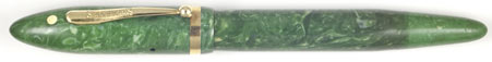 17201: Sheaffer oversize Lifetime Balance: jade green lever-filler, 14.5 cm long, early extra-long model with short section, pointed barrel end, "PAT'D - PAT. PENDING" imprint, large White Dot; tapered end of barrel made separately and attached, some discoloration to end of the part of the barrel made from tube stock, but overall color preservation unusually good, no brassing to trim, deep imprints. Bold writer with firm semistub tip.
