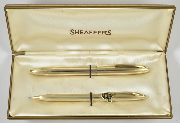 17203: Sheaffer Touchdown Triumph set in box: pneumatic-filler, gold filled cap and barrel, White Dot, 13.4 cm long, two-tone conical Triumph nib with original grade band, section with transparent ink window; matching twist-action pencil uses .9 mm lead, has original foil clip tag. A scarce and short-lived model introduced early in 1950 and replaced by the more common Snorkel version in late 1952. As new, seals replaced, one tiny bump to pen cap (see detail).
