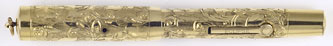 17210: Eclipse lever-filler: black hard rubber ringtop, 10.65 cm long, gold filled overlay with hand engraved floral decoration of excellent quality; nib is a wet-writing rounded stub.