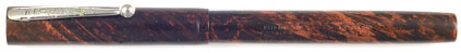 17211: Sheaffer 3 Self-Filling: mottled hard rubber lever-filler, 13.7 cm long, nickel plated trim, narrow feed, #3 Self Filling nib; imprints notably crisp, spots of flaking to plating on clip (actually an indication of notable preservation: on most pens of this age, the nickel plating is completely gone, only the nickel silver base material is visible).