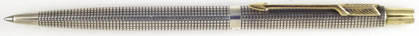 17214: Parker Classic ballpoint: sterling silver grid pattern, gold plated trim, button actuated, made in USA, marked "STERLING CAP & BARREL", no date code, uses standard Parker refills. Clean condition, noting plating wear to sides of actuator button (see detail).