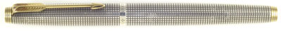 17215: Parker 75: sterling silver grid pattern, gold plated trim, made in USA, marked "STERLING CAP & BARREL"; section with angle indicator, includes recent piston-style convertor, US-made 14K nib has feed marked "F" but writes a wider line. A couple of very shallow bumps to barrel, too shallow to photograph, overall appearance excellent.