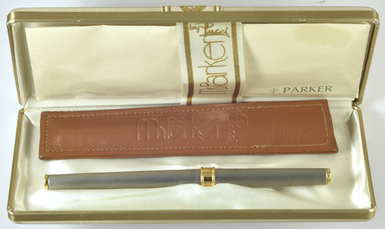 17229: Parker 180 Ms. Parker rollerball in box: brushed stainless steel with gold plated trim, bold barrel band; 13.1 cm long, clipless, designed by Emilio Pucci, takes standard Parker refills; made in USA, instruction sheet dated 1977.