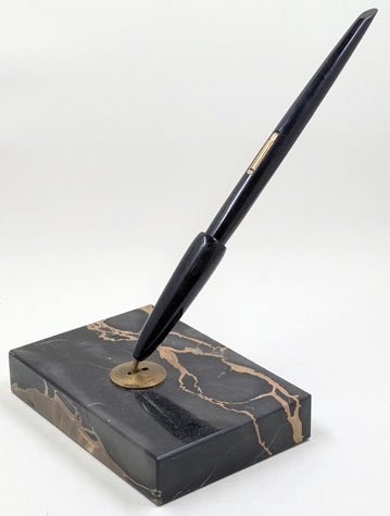 17248: Waterman desk set: black lever-filler, gold filled trim, #5 nib is an uncommon factory italic; USA production, stone base measures 4.75 x 3.25 inches (12 x 8 cm), bottom felt marked "MADE IN BELGIUM". A handsome mid-century modern design.