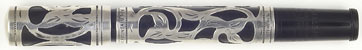 17166: Waterman 412 VS: black hard rubber safety pen, 11.7 cm long, sterling silver "Filigree" overlay, very early production with threaded turning knob, nib spirals in and out. Clean example, strong imprints, one ding in cap crown (see details). Long-tined New York #2 nib is extremely flexible.