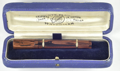 17169: Waterman 42½V: woodgrain red and black hard rubber vest pocket safety, 8.9 cm long, made in the USA for the French market, 18K nib and "wedding ring" barrel bands, all with French hallmarks.