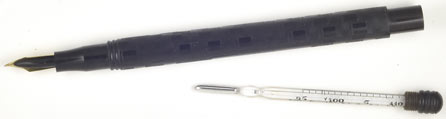 17186: Laughlin doctor's pen: black chased hard rubber straight-cap eyedropper-filler, thermometer in compartment at end of barrel; 15.9 cm long, crisp and glossy with only slightest fading; found as new old stock and without a nib, never filled -- we have installed a used but intact Laughlin nib of the same era.