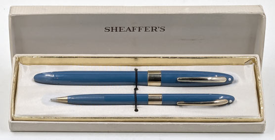 17174: Sheaffer Snorkel Statesman set in box: Pastel Blue pneumatic-filler, 14.2 cm long, gold filled trim, White Dot, palladium-silver alloy conical Triumph F4 nib, matching pencil uses .9 mm lead, appears to be new old stock but no price stickers.